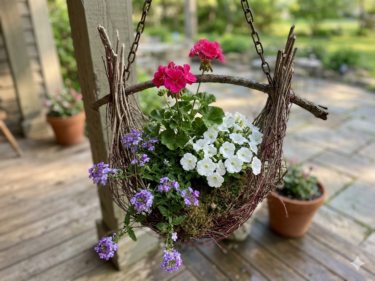 Learn the art of transforming finely tipped branches into a sculptural hanging basket. You’ll bundle twiggy branches into a rustic vessel, secure it beneath a character‑filled branch, and line it with moss. Then you’ll plant a dynamic trio — thriller, spiller, and filler — to create a beautiful living arrangement that feels like a little piece of woodland magic.